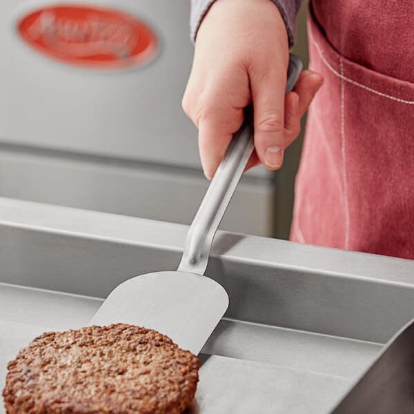 Easily flip and serve food with this 14" flexible stainless steel solid spatula / turner. This turner is made of durable stainless steel to stand up to daily use in your kitchen. When you're done cooking, the hanging hole makes storage a breeze. Its one-piece design ensures easy cleaning, saving you time and effort in your busy kitchen.The flat shape of this spatula / turner is perfect for use on a pan plate, allowing you to easily flip and serve food. Its 14" length allows you to keep a safe distance from the stove or grill while still maintaining control when handling hot and heavy items. Use this spatula / turner to help you create delicious entrees, appetizers, and desserts!Overall Dimensions:Length: 14"Width: 3"Height: 1/16"Handle Length: 8 1/4"Handle Width: 1 1/2"Blade Length: 6"Blade Width: 3"