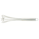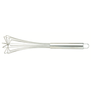 10" Stainless Steel Whisk. The flat base design of this whisk allows you to reach the 90 degree corners of sauce pans, making it perfect for sauces. The flat design also allows the whisk to stand upright when not in use.